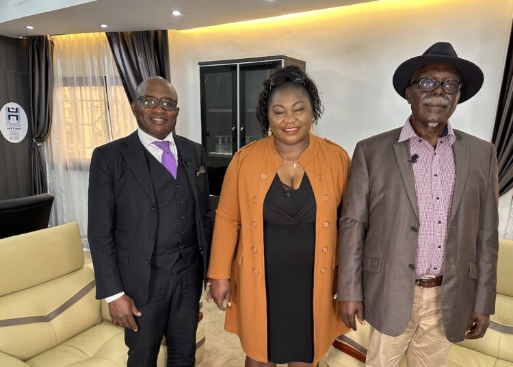 Le President exécutif de HITAS le Juge Maurice Kamga accompagné du Dr Sylvie Nantcha(TANG) et le conseiller M. Fotso au campus de l'école à Douala le 15 juin 2023 lors des journées portes ouvertes.